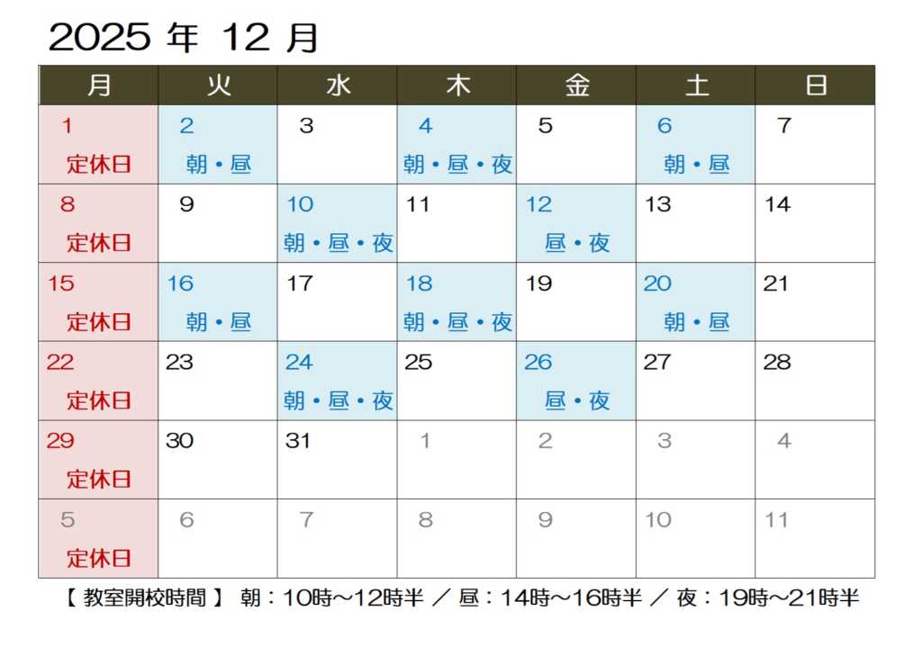2025年12月の授業日程のおしらせです。
